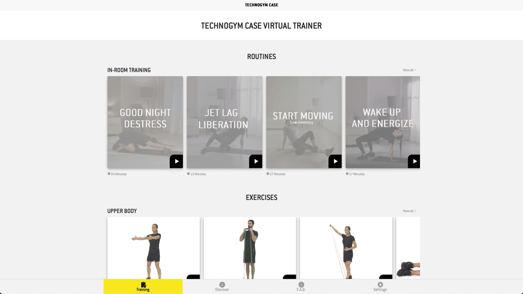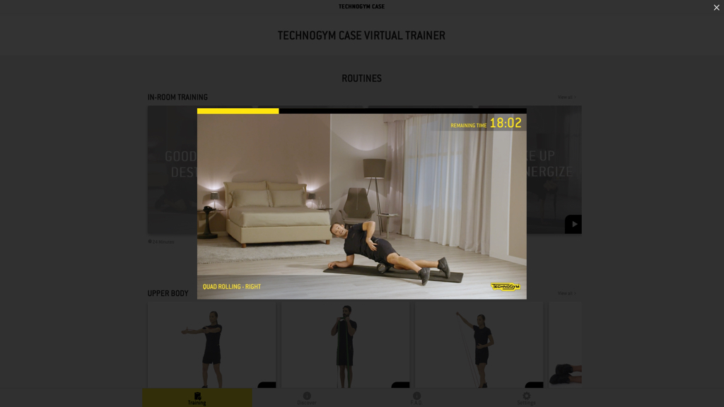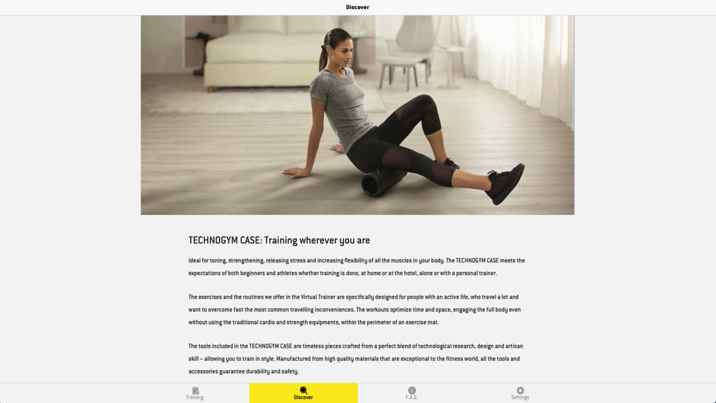 The exercises and the routines offered in the Technogym In Room Training app are designed for people with an active life, who travel a lot and want to overcome fast the most common travelling inconveniences. The workouts optimize time and space, engaging the full body. You will use Technogym tools and accessories, within the perimeter of an exercise mat.